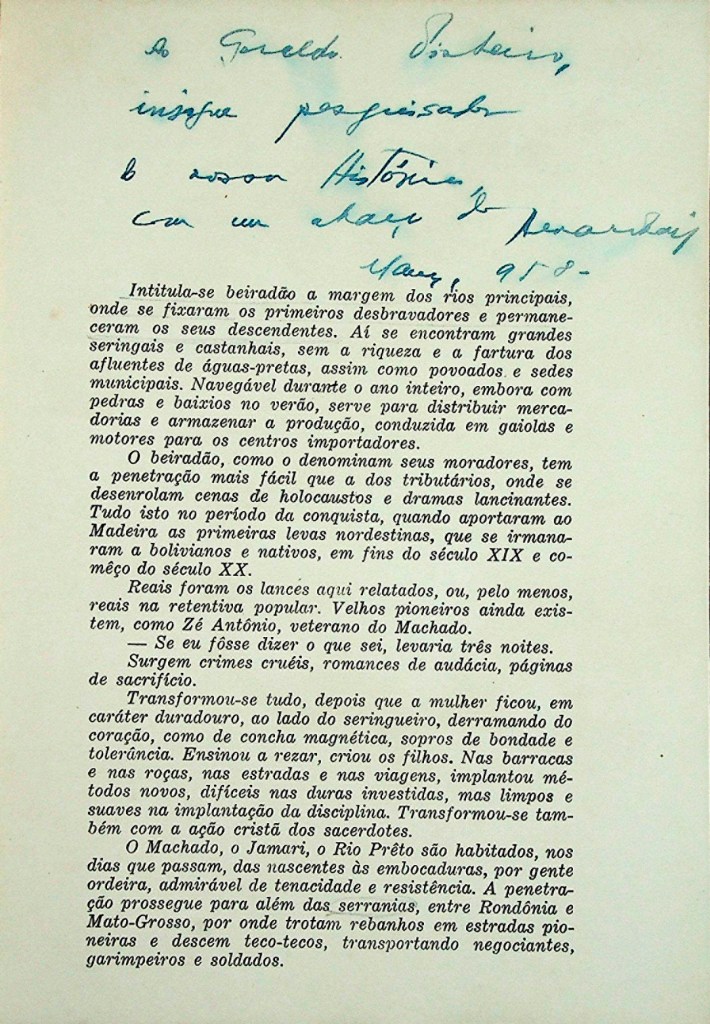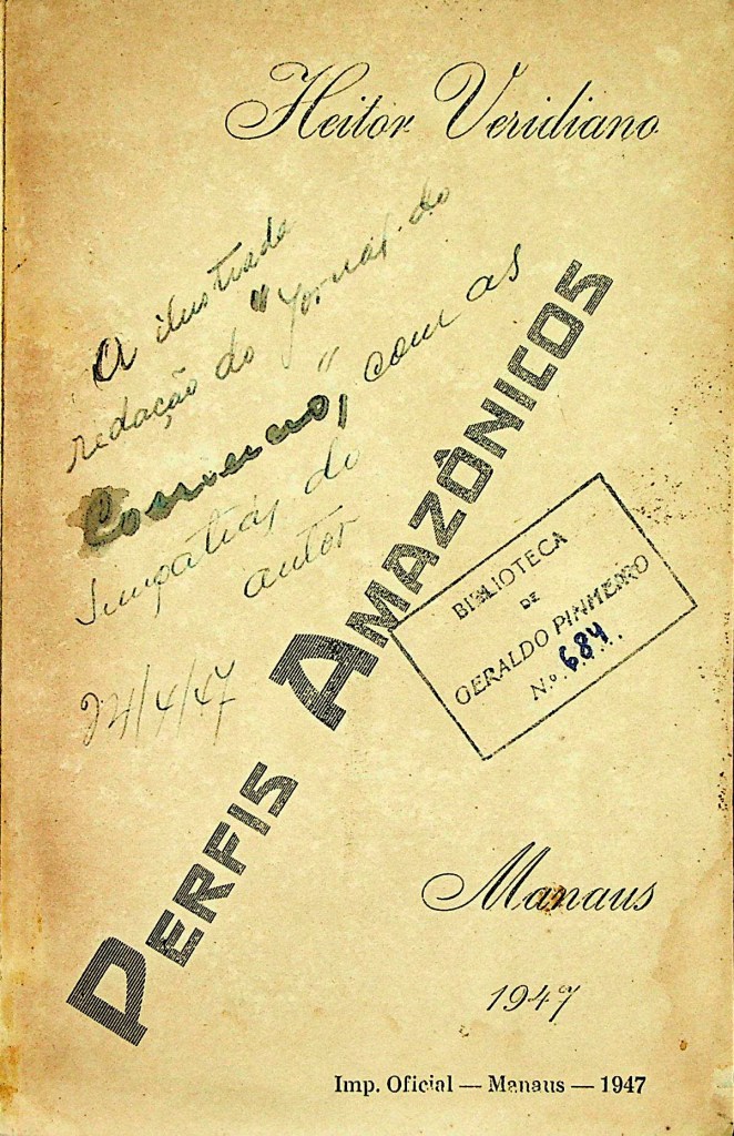 Dentre as características que mais notabilizaram Geraldo Pinheiro na capital amazonense, estava a primorosa biblioteca que formou desde sua mocidade. Leitor voraz, atacava os livros munido com um lápis bicolor, com o qual marcava autores e destacava passagens, além de anotar as datas de aquisição (na página de rosto) e da finalização da leitura, na página final. Assim fez com A Intelectualidade do Extremo Norte, de Anísio Jobim, cujo PDF aqui disponibilizamos.